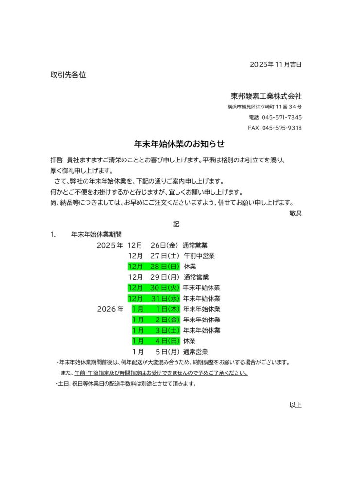 なお、休業期間中の配送を含め、ご不明な点は弊社各営業担当までご相談ください。